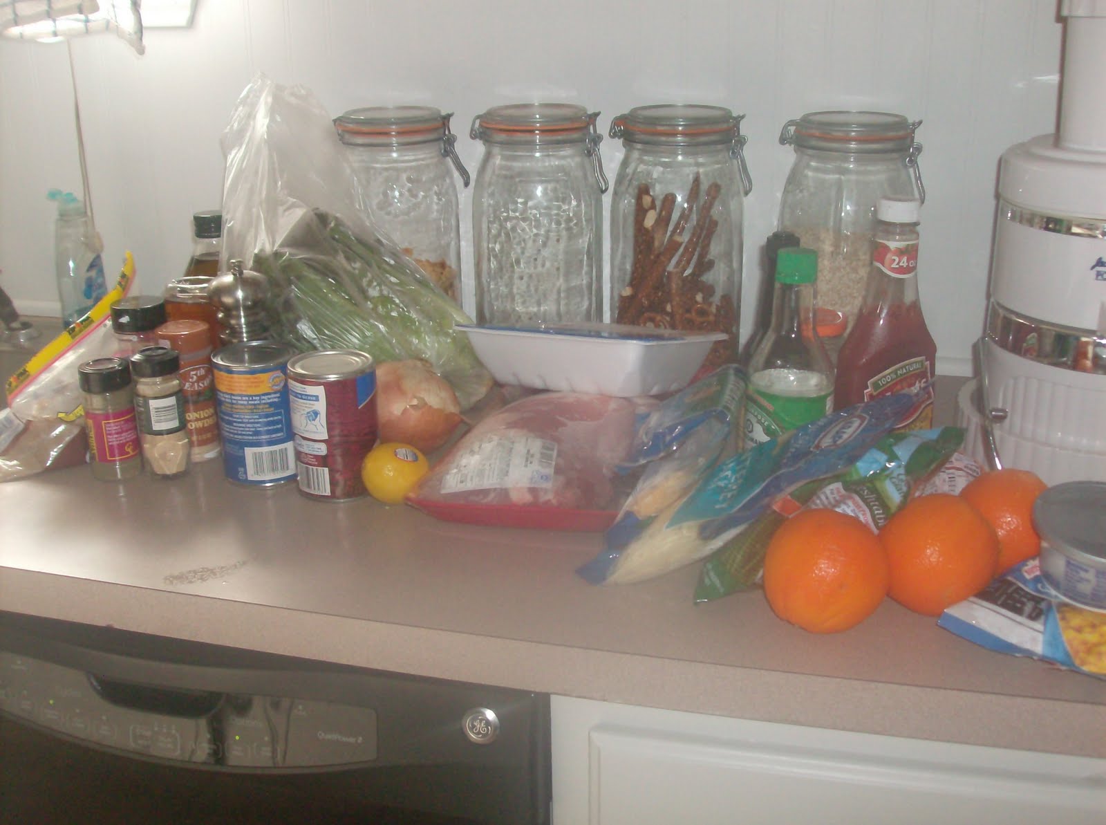 I don’t feel like I make any bigger of a mess doing all 5 dinners than if I just do one. Most utensils are reused during the cooking hour. Here is a look at a cooking session mess.