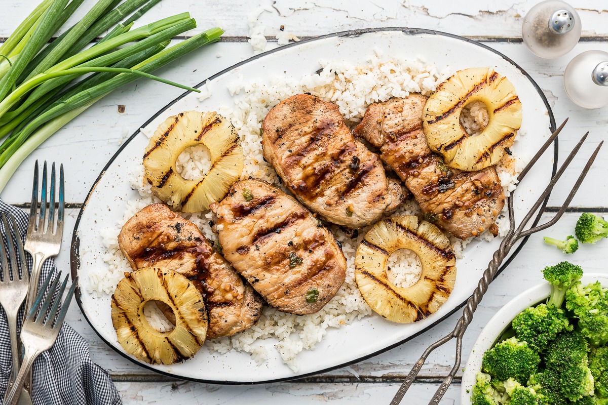 - Prepare rice and broccoli per package instructions. Serve with grilled pork chops and pineapple.